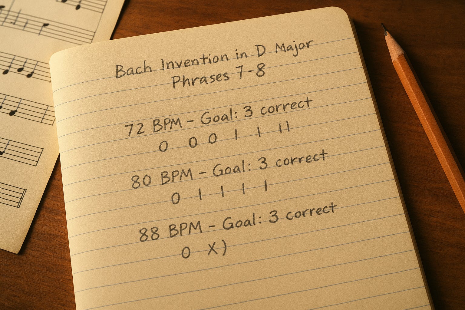 Over the past few weeks, we’ve been building a toolkit for music practice design: repetitions and repetition sets1, keeping track of progress2, taking a piece of music apart and putting it back together3, and nested repetition sets4.